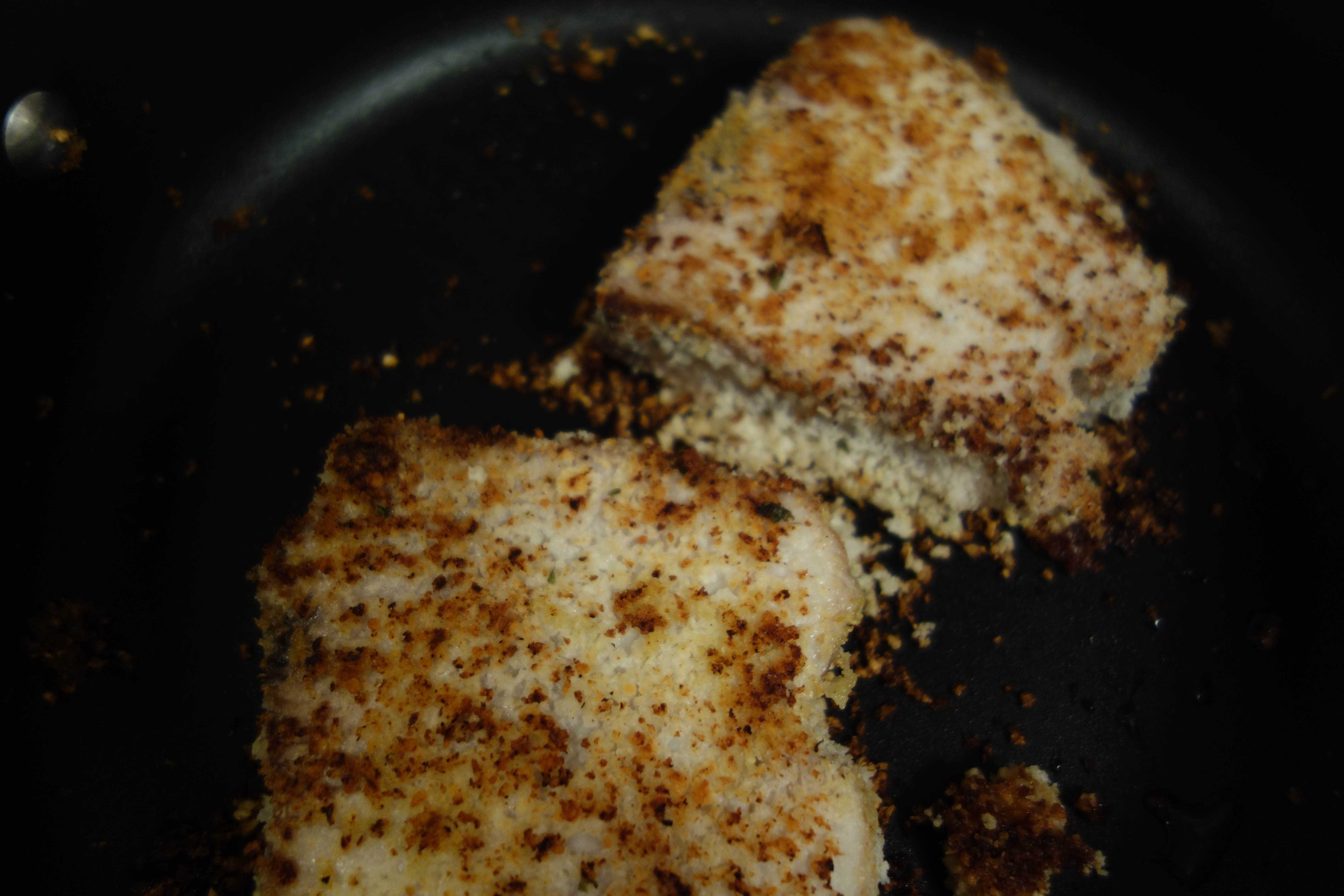 Heat a skillet with olive oil before doing the next step since it only takes a minute. Pat the tuna lightly with a paper towel to absorb some of the moisture. Coat both sides of the tuna in the parmesan-breadcrumb mixture. That’s right! You don’t have to dip it in egg first or anything. Told you this is easy.
