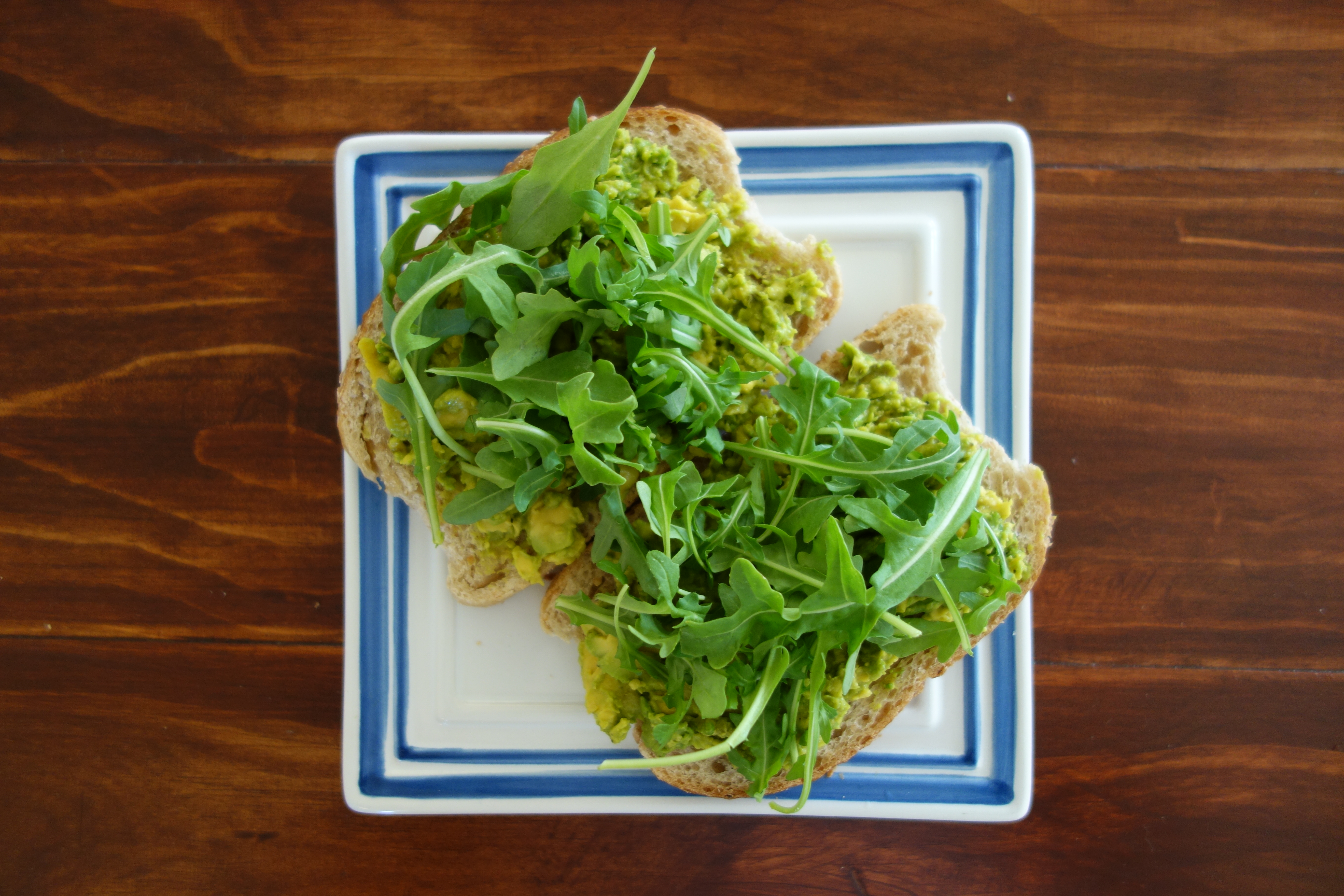 Toast the bread in a toaster, on broil in the oven, or on the grill. Spread the avocado on the toasted bread. Top with arugula. That’s it!