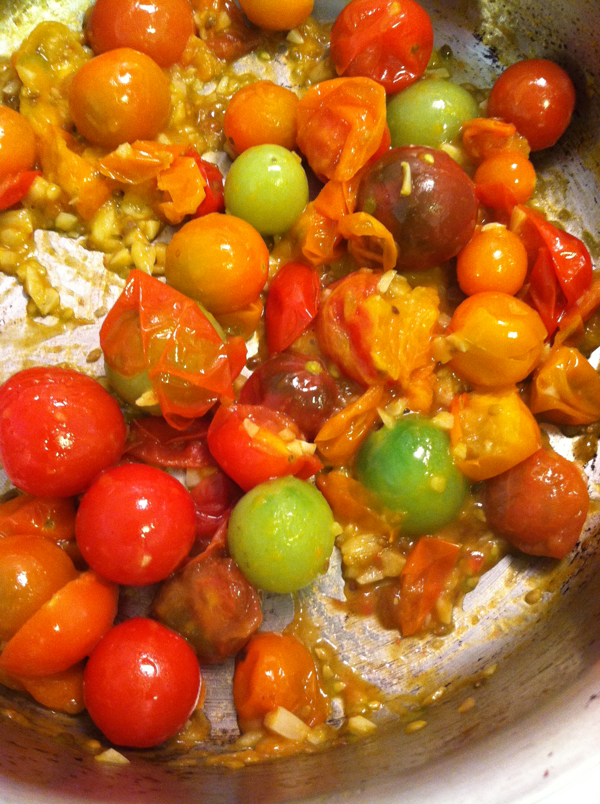 Mince garlic and slice 1/2 of the tomatoes. In a large pan heat olive oil and sauté garlic until fragrant (this only takes a minute or two). Add all of the tomatoes, season with salt, and cook on medium for about 7-10 minutes. The halved tomatoes should release all their juices and the whole should begin to shrivel.