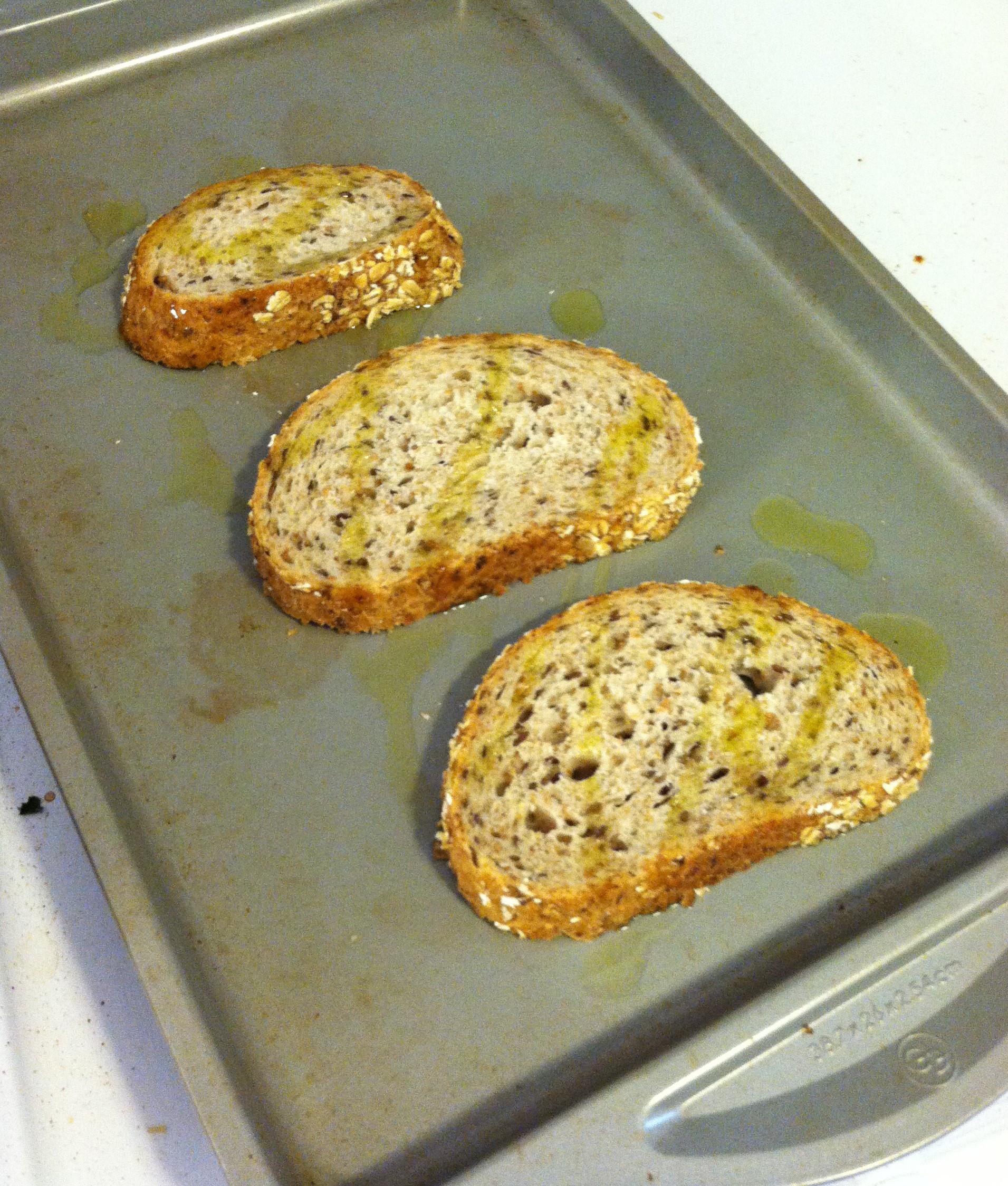 - Place bread slices on baking sheet and brush both sides with olive oil