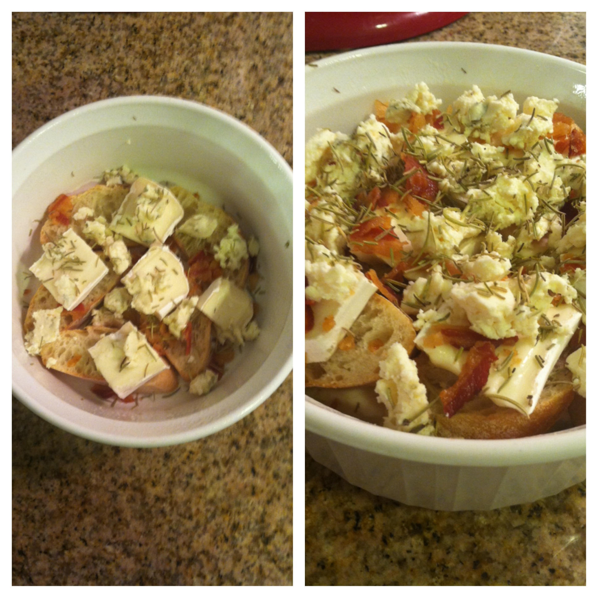 - Repeat the layer once more (bread, cheeses, bacon, rosemary)