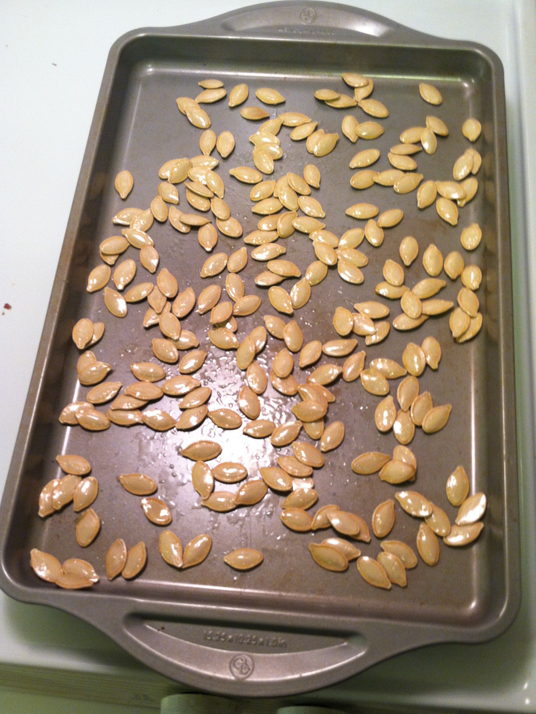 Most people just throw out all the goop and seeds from their carved pumpkins this month, but my mother was not one of those people. She would collect up the remains of our beautiful carved creations, disappear into the kitchen for a while and then later that night she was snacking on what is now one of my favorite fall snacks.