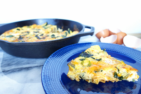 Sometimes I forget how satisfying a frittata can be. Aside from being a quick meal, it is a great use to use up vegetables (and anything you want to put in it) that look like they’re getting ready say goodbye. Have lots of half used veggies you need to cook? Throw them in a frittata! Can you sauté vegetables? Can you add eggs to said sautéed vegetables? Can you put that combination in the oven? If you answered yes to those questions, you can make a frittata! If you answered no, well, I want to help you. A frittata is basically a crustless quiche. Along with the fact that this is not made with heavy cream, this is a much healthier alternative to a quiche. It is filling enough by itself, but you can also serve it with baby arugula salad or toast.