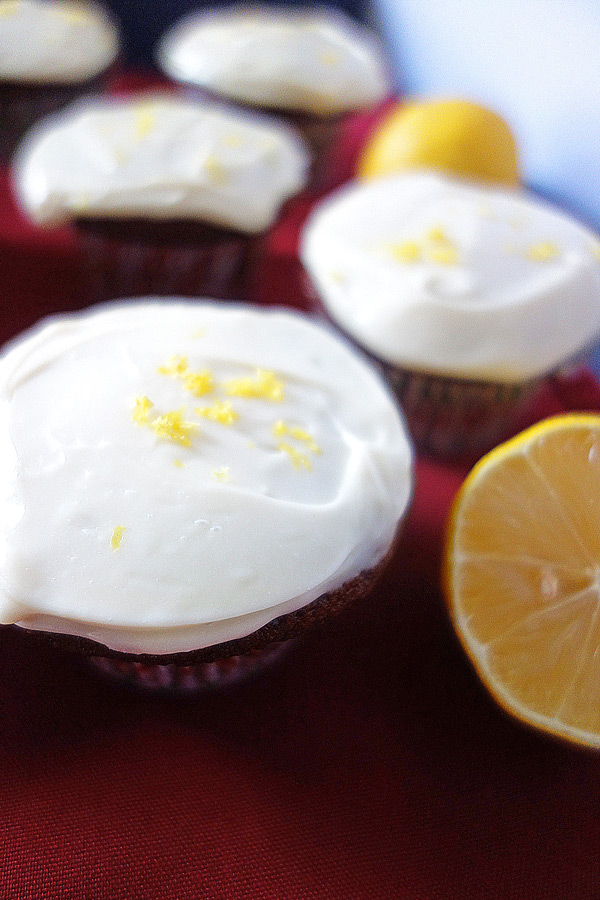 - Once cupcakes cool, frost with lemon cream cheese frosting.