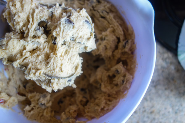 - Add flour mixture to creamed butter and sugars. Slowly stir in chocolate chips with spoon.