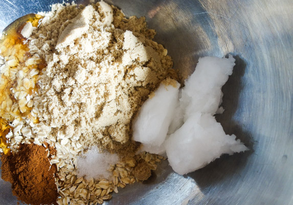 Begin by mixing raw oats, sugar, honey, salt, cinnamon, and coconut oil.