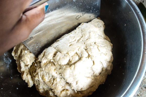 Add the yeast and flours and knead the dough for 10 to 15 minutes. If you have a Kitchen Aid mixer, this step will be much easier for you. However, I don’t have one so I do it the old-fashioned way. The dough should be fairly smooth by the time you’re done kneading.