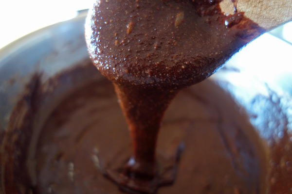 Transfer the chocolate mixture into a mixing bowl and let it cool for a few minutes. Add the eggs. Stir the chocolate mixture well until the eggs are completely mixed in. Stir in the almond meal and flour until completely incorporated.