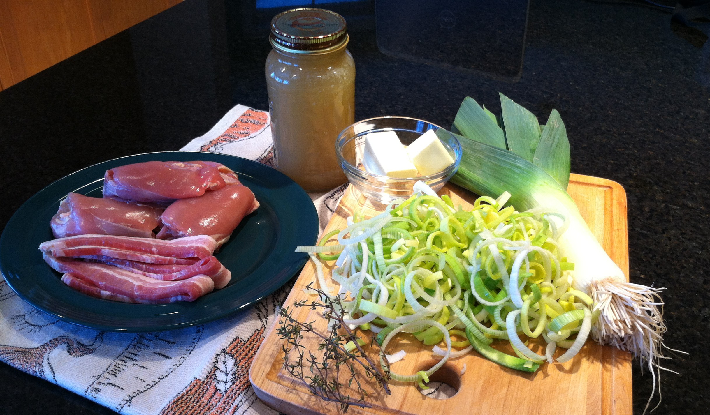 Season chicken with salt and pepper and cook in the bacon skillet until brown, about 3 minutes per side. Cover the pan and cook an additional 10-12 minutes to ensure chicken is cooked through, then transfer chicken to a plate. Add leeks to the pan and cook, stirring often, until softened.