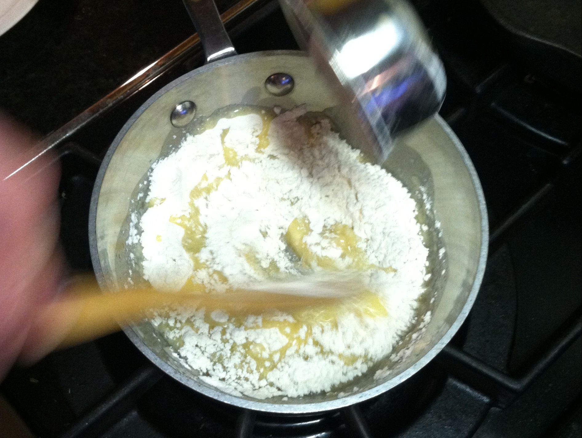 - Whisk in 3/4 cup flour and cook, whisking constantly, until golden brown (about 3 minutes), creating a roux