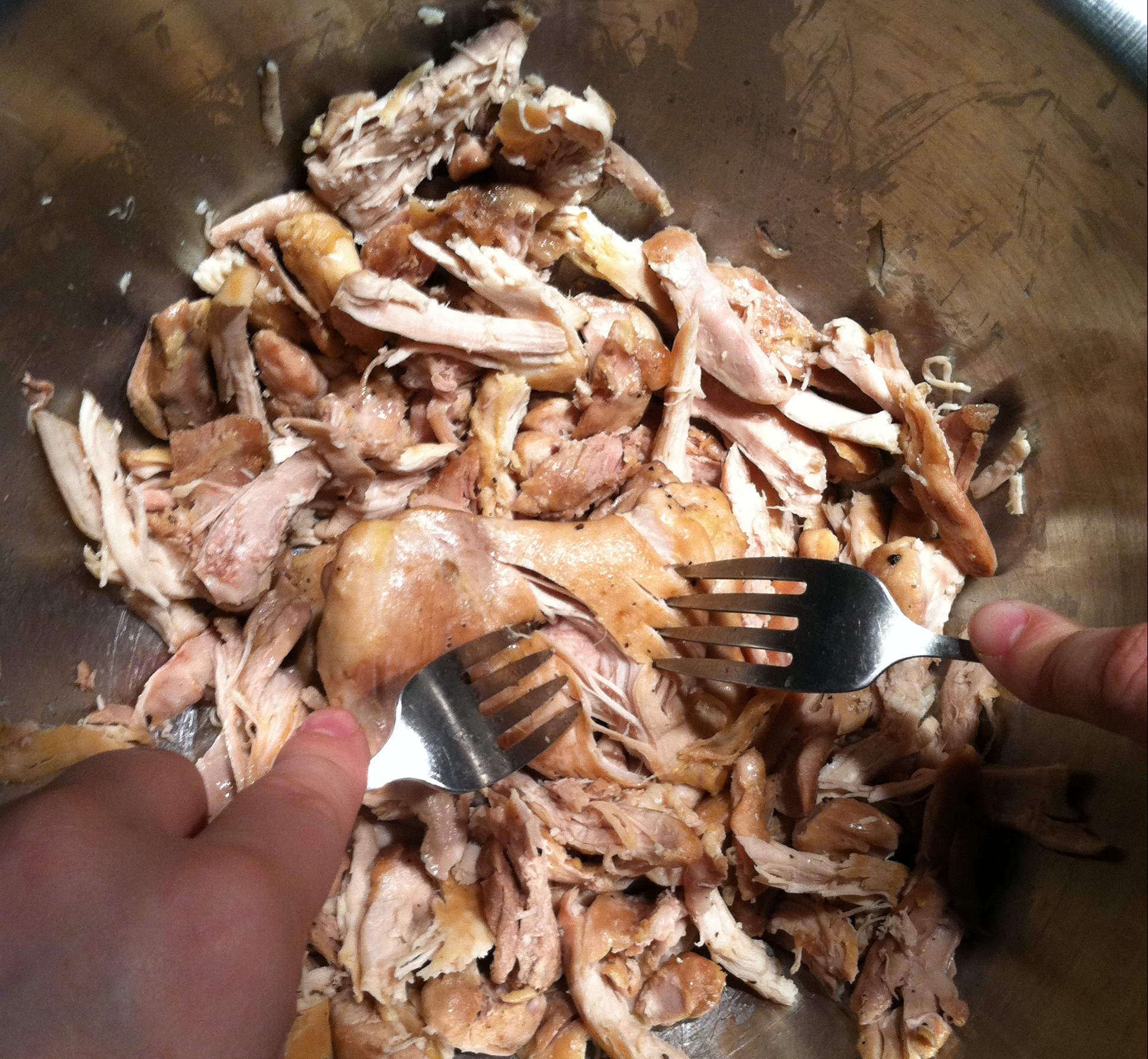In a large bowl, shred the chicken (using two forks works best). Add the leeks, bacon and thyme leaves to the chicken.