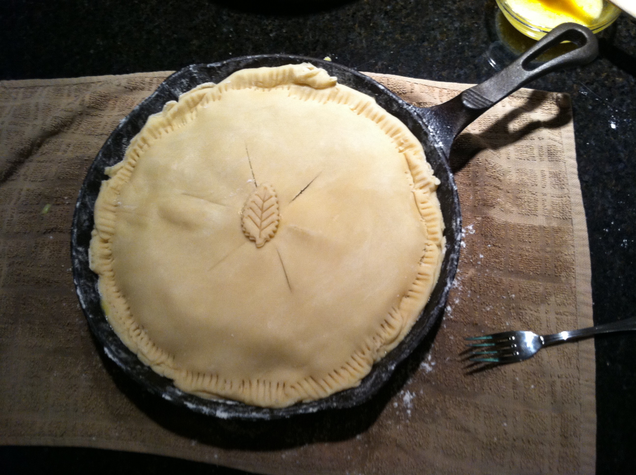 Roll out 1/2 of dough on a lightly floured surface to a 14″ round. Transfer dough to a 10″ cast iron skillet or 9 1/2″ deep pie dish, leaving about a 1/2″ to 1″ overhang. Spoon the filling into skillet or pie dish.