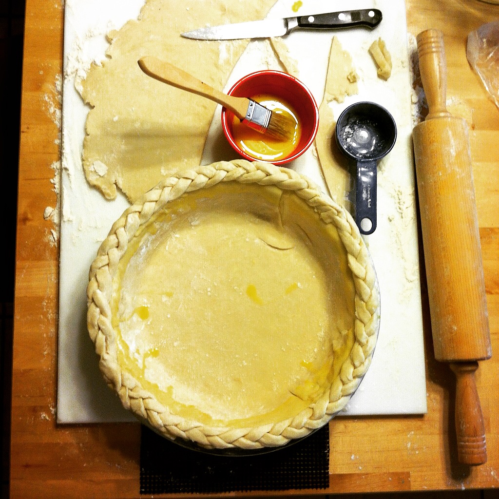 Score the edge of the pie and brush it with the egg. Brush the underside of the braid with egg and carefully place around the edge of the pie, pressing together sections are you go. Freeze for 15 minutes and preheat the oven to 350 degrees.