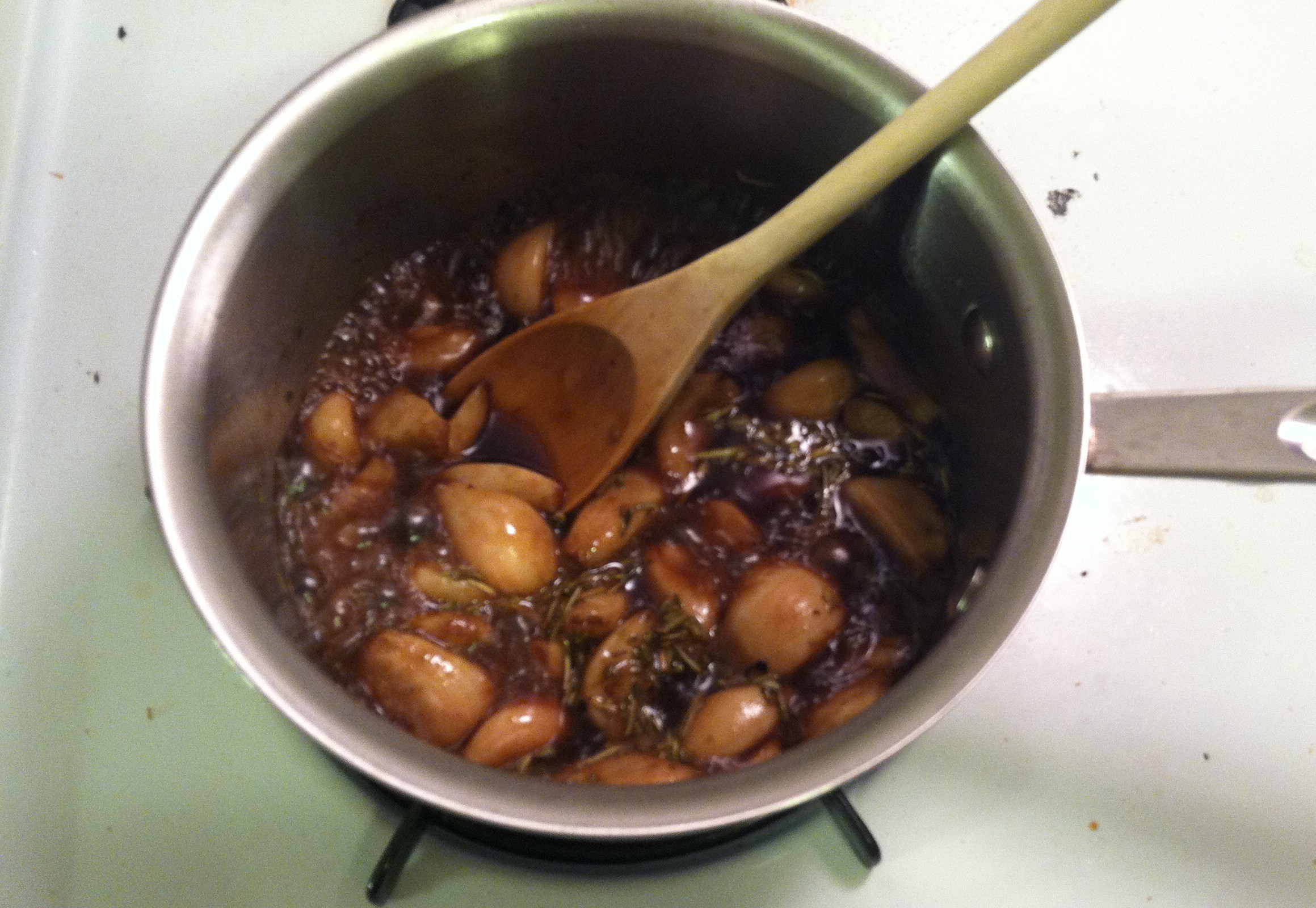 Add vinegar and one cup water and bring to a boil. Reduce the heat and simmer until garlic is tender, about 10-12 minutes. Preheat oven to 350 degrees, add the maple syrup, rosemary and thyme, to the garlic then season with salt and pepper. Cook, stirring occasionally until liquid is syrupy and coats the garlic, about 5 minutes.