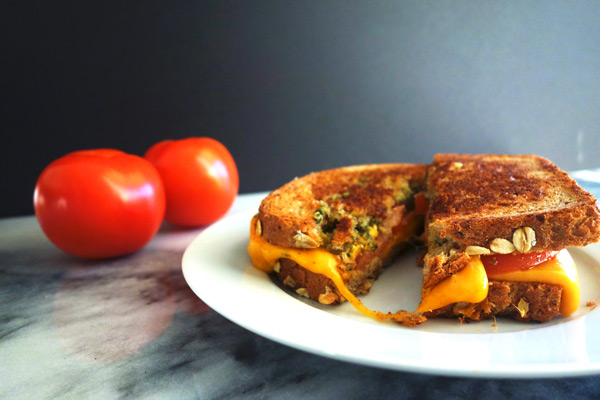 Grown Up Grilled Cheese with Homemade Pesto and Heirloom Tomatoes